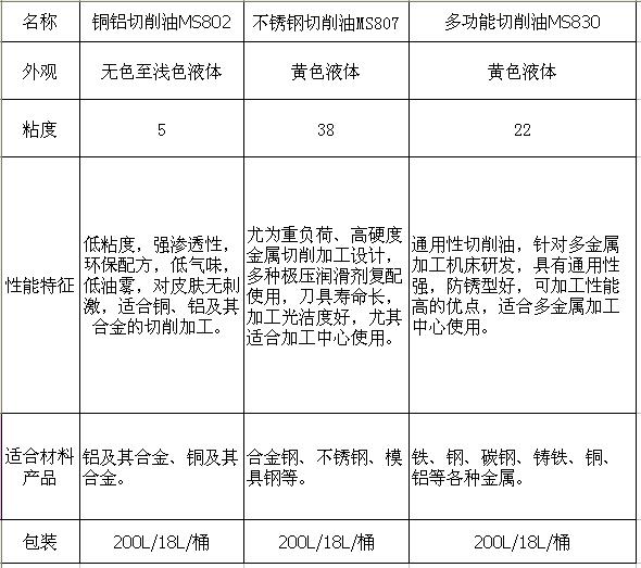 對皮膚無刺激,適合銅、鋁及其合金的切削加工;尤為重負荷、高硬度金屬切削加工設(shè)計,多種極壓潤滑劑復(fù)配使用,刀具壽命長,加工光潔度好,尤其適合加工中心使用;通用性切削油,針對多金屬加工機床研發(fā),具有通用性強,防銹型好,可加工性能高的優(yōu)點,適合多金屬加工中心使用。